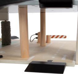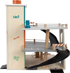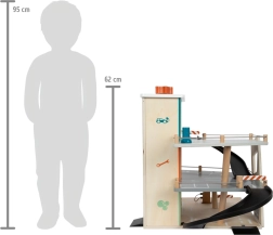Entdecken Sie den vielseitigen Holz-Parkplatz mit drei Ebenen, funktionsfähigem Aufzug und sanften Rampen für stundenlangen kreativen Spielspaß. Inklusive 2 Autos, Tankstelle und Ladestation, Hebebühne und Waschanlage mit realistischen Bürsten. Mechanische Schranken auf jeder Ebene und Gummileitplanken für sicheres Fahren verleihen dem Spiel Dynamik. Die robuste Kombination aus Holzsperrholz, Massivholz und unbedenklichem Kunststoff sorgt für lange Haltbarkeit.