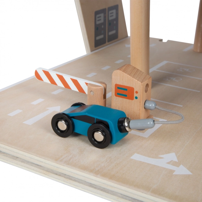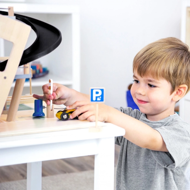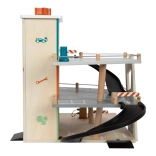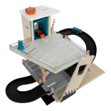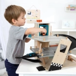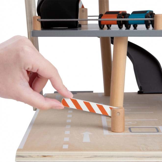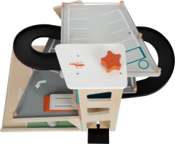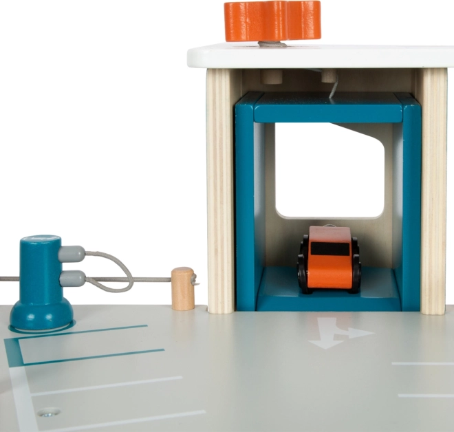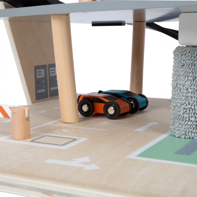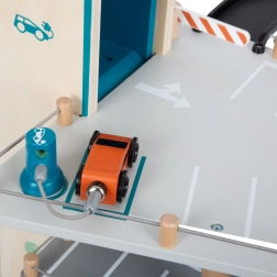 Dieser designstarke Holz-Rennparkplatz bietet Kindern eine umfangreich ausgestattete Spielwelt. Drei Ebenen sind über einen funktionierenden Aufzug und zwei sanfte Rampen verbunden, die eine flüssige Bewegung der Autos ermöglichen. Jede Ebene ist mit einer mechanischen Schranke und Gummileitplanken versehen, was die Dynamik erhöht und das Herausfallen der Fahrzeuge verhindert. Farbige Symbole und Verkehrszeichen fördern spielerisches Lernen und regen die Fantasie an.