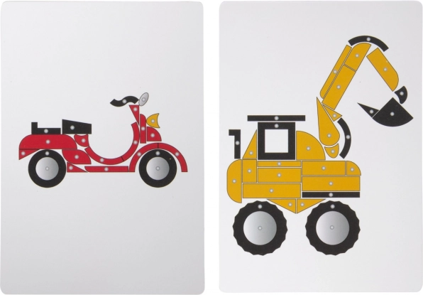 Mit diesem klassischen Hammer-Spiel in modernen Farben können Kinder Bilder von Verkehrsmitteln und Baumaschinen nach sechs Bildvorlagen oder ihrer eigenen Fantasie erstellen. Hauptmerkmale: