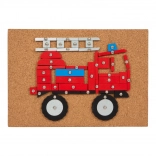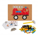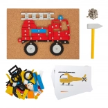 Umfangreiches kreatives Spielset mit Verkehrsthema, das eine Korkunterlage, einen Holzhammer und viele hölzerne Teile in verschiedenen Formen und Farben enthält. Hilft, Kreativität, Geschicklichkeit und Hand-Auge-Koordination zu entwickeln.