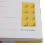 Jede linierte Seite enthält eine Illustration eines Steins in einem bestimmten LEGO-Farbton, die das Schreiben angenehmer macht und die Kreativität fördert.
