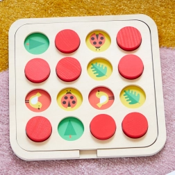 Das Spielbrett mit 16 Abdeckscheiben ist für kleine Spieler ab 3 Jahren konzipiert. Es fördert die Entwicklung kognitiver Fähigkeiten, das Erkennen von Formen und Farben sowie Geduld und Konzentration. Die Illustrationen sind klar, verspielt und leicht zu erkennen.