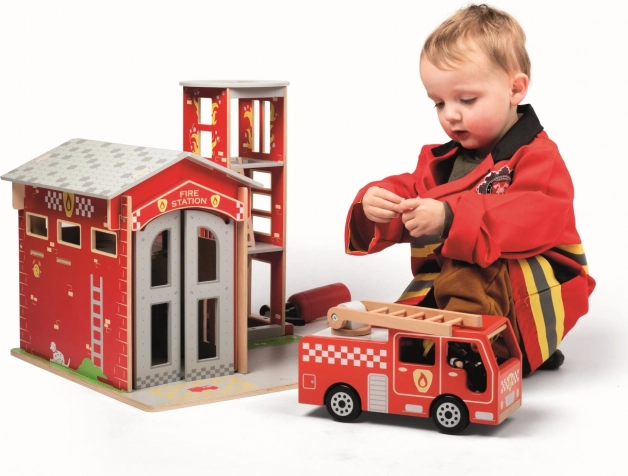 Zum Lieferumfang gehören ein hölcherner Feuerlöscher, ein Funkgerät und ein Megafon – alles für authentische Feuerwehreinsätze und endlose Geschichten.