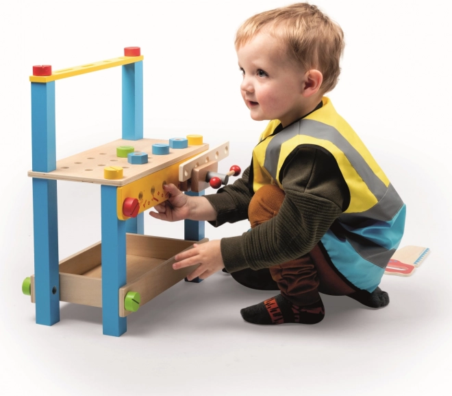 Zum Set gehören Holz- und Kunststoffwerkzeuge – Säge, Schraubendreher, Rohrzange, Hammer, Schutzbrille und Ausweis. Kinder können so die Arbeit von Bauprofis nachahmen und ihre Feinmotorik fördern.