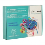 • Verschiedene Spielmodi: magnetisches Angeln von Fischen und Raupen, Übertragen mit Pinzette/Stäbchen, Farbsortierung, einfache Aufgaben mit Zahlen, Zählübungen als Brettspiel.