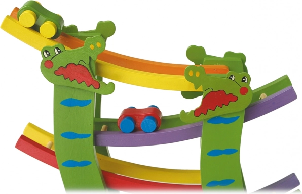 Diese Holz-Rennbahn mit Krokodilen verwandelt das Kinderzimmer in eine kleine Rennstrecke. Kinder setzen das Auto am Start an und beobachten, wie es schwungvoll Ebene für Ebene bis ins Ziel gleitet. Kräftige Farben und das fröhliche Krokodilmotiv laden immer wieder zum Spielen ein.