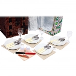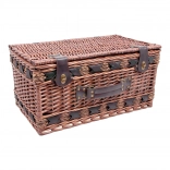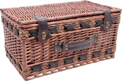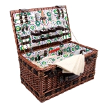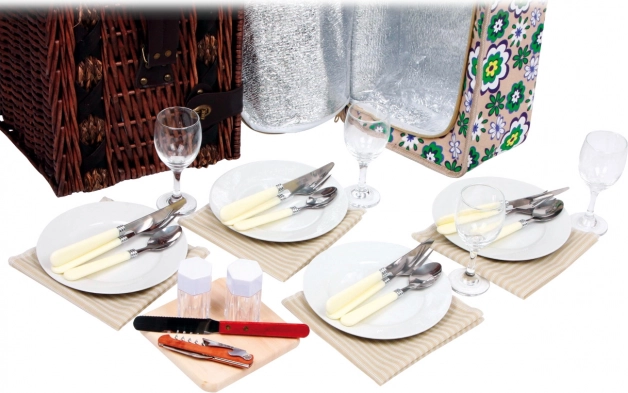 Der Korb enthält alles Notwendige für ein Picknick mit Familie oder Freunden: Teller, Besteck, Weingläser, Messer, Pfefferstreuer, Salzstreuer und Servietten.