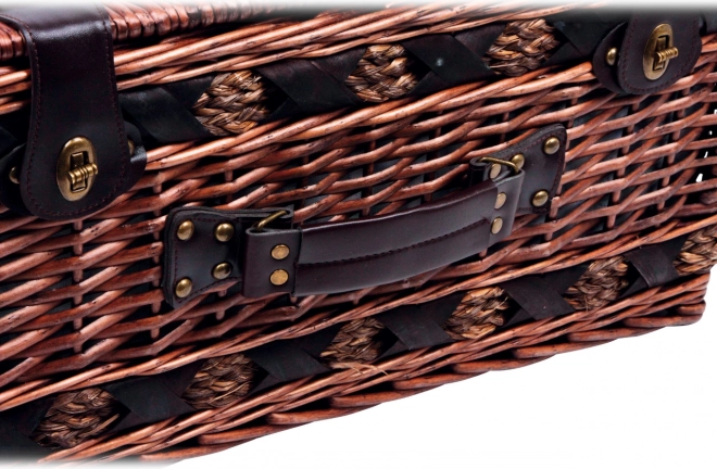 Der Deluxe-Picknickkorb ist die ideale Wahl für alle, die nicht nur Funktionalität, sondern auch Ästhetik schätzen. Dieser Korb ist vollständig mit allem ausgestattet, was vier Personen benötigen, einschließlich Teller, Besteck, Weingläser, Messer, Pfefferstreuer und Salzstreuer. Das gezeigte Design verbindet rustikalen Charme mit moderner Praktikabilität.