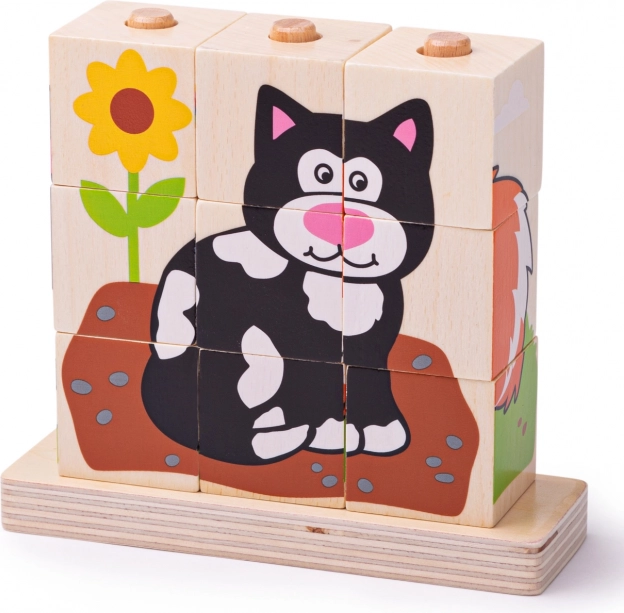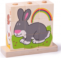 Neun Würfel ergeben vier verschiedene Tiermotive, die zum wiederholten Puzzeln einladen und logisches Denken sowie visuelle Wahrnehmung fördern.