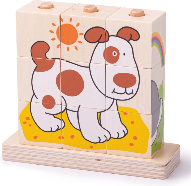 Das Set enthält insgesamt 10 Teile9 Würfel, die 4 verschiedene Bilder ergeben, sowie eine Holzbasis mit Stäben für sicheres und übersichtliches Stapeln. Das Spielzeug ist aus strapazierfähigem Holz mit glatter Oberfläche gefertigt und erfüllt die aktuellen europäischen Sicherheitsnormen.