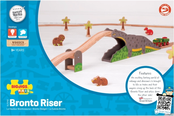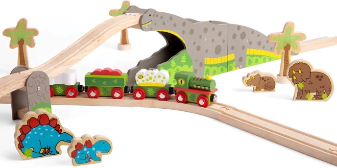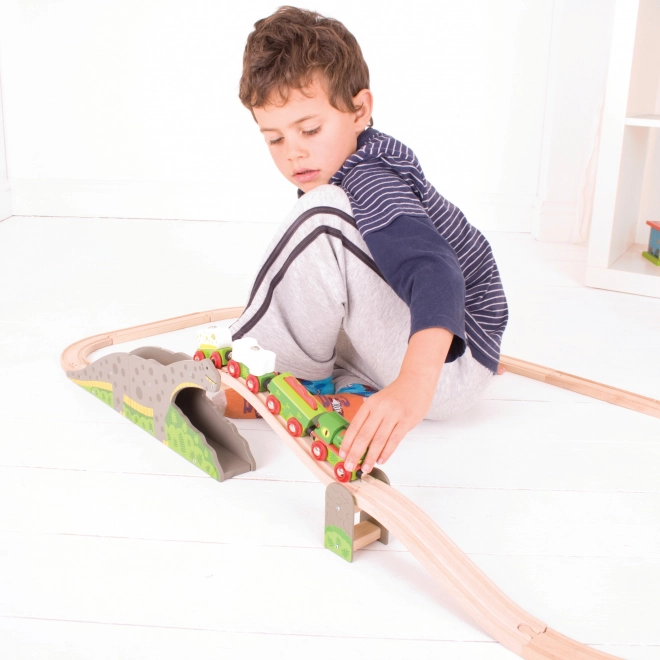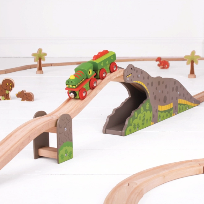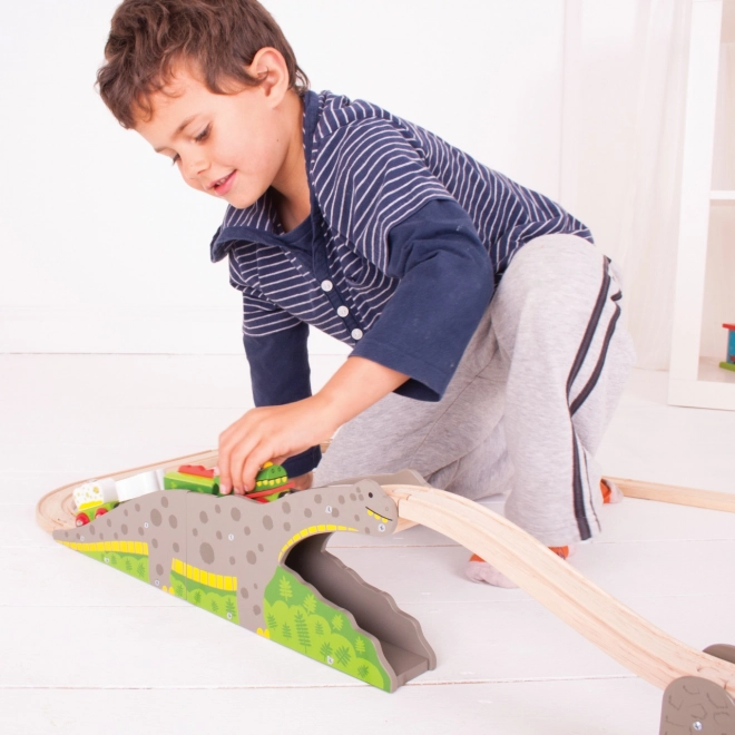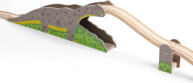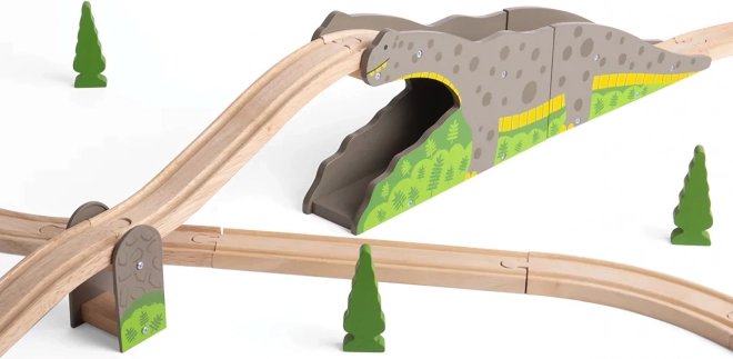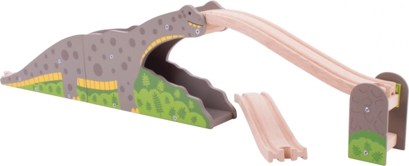 Gönnen Sie Kindern ein originelles Element für ihre Eisenbahn – die Dinosaurierbrücke, die jede Fahrt in ein Abenteuer verwandelt. Die robuste Holzkonstruktion mit Dinosauriermotiv ermöglicht es Zügen, über den Rücken zu fahren und durch den Tunnel zu rollen, was die Streckenvielfalt erhöht und kreatives Spiel unterstützt.