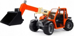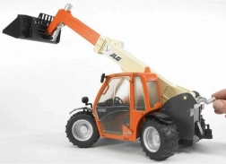 Der Teleskoparm wird mit einer Kurbel am Heck angehoben und kann bis auf 40 cm ausgefahren werden. Die Frontschaufel ist kippbar und lässt sich leicht gegen BRUDER-Zubehör austauschen (Palette, Winde, Gabeln – BR2318). Die Kabine aus bruchsicherem Polycarbonat mit öffnenden Türen sowie eine Anhängekupplung runden das authentische Bedienerlebnis ab.