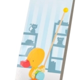 Niedliche Ente aus bunt lasiertem Holz, die beim Schieben hin- und herschaukelt auf ihren Beinchen. Unterstützt Kinder beim Laufenlernen und begleitet sie bei ihren ersten Schritten.