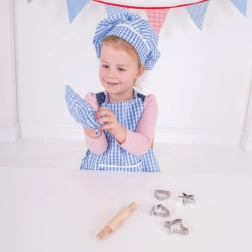 Junge Köche werden dieses helle und angenehm blaue Baumwollset zum Backen und Kochen lieben. Es enthält eine Schürze, einen Ofenhandschuh, eine Kochmütze, ein Nudelholz und Ausstechformen, ideal für spaßiges Kochen und Rollenspiele.