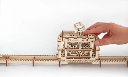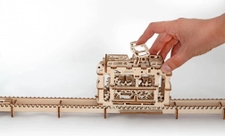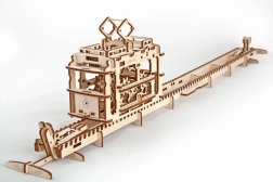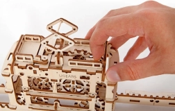 Das Modell verfügt über einen Aufziehmechanismus für Vorwärts- und Rücklauf, wodurch die Kabine auch bergauf fahren kann. Ein praktischer Stauraum ist unter dem Dach-Notausstiegsfenster verborgen. Der Bausatz besteht aus hochwertigem Furnier, wird ohne Klebstoff montiert und enthält eine detaillierte Anleitung.