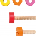 Bunte Holzschrauben und Muttern dienen zur Übung der Feinmotorik und zur Hand-Auge-Koordination.