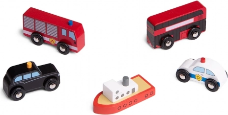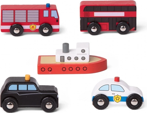 - 5 Teile im Set: Feuerwehrfahrzeug, Polizeiauto, Doppeldeckerbus, Taxi, Boot.