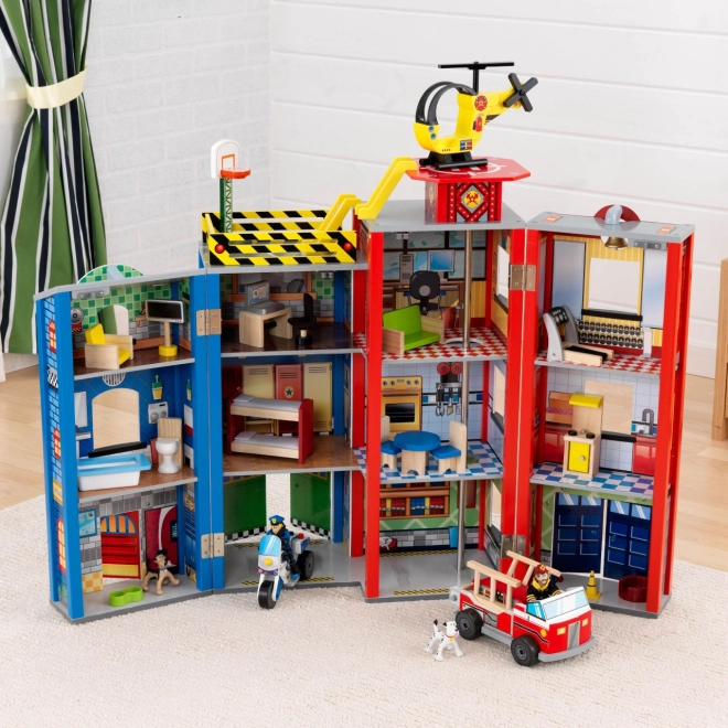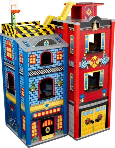 Das **KidKraft Alltagserlebnis-Spielset** ist der Traum jedes kleinen Beschützers. Diese dreistöckige Polizei- und Feuerwache bietet viele Räume für verschiedene Aktivitäten, Arbeit und Erholung. Auf dem Dach gibt es einen Hubschrauberlandeplatz und einen Spielplatz. Perfekt für mehrere Kinder, um gemeinsam Abenteuer zu erleben.