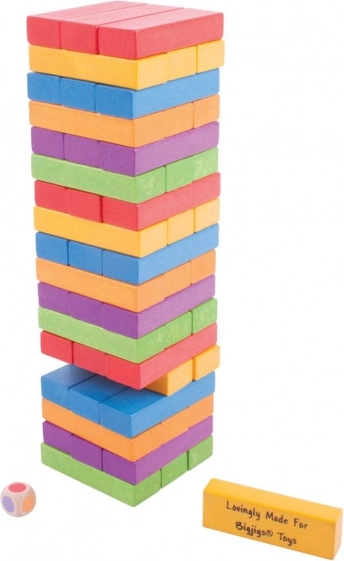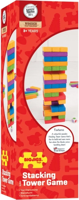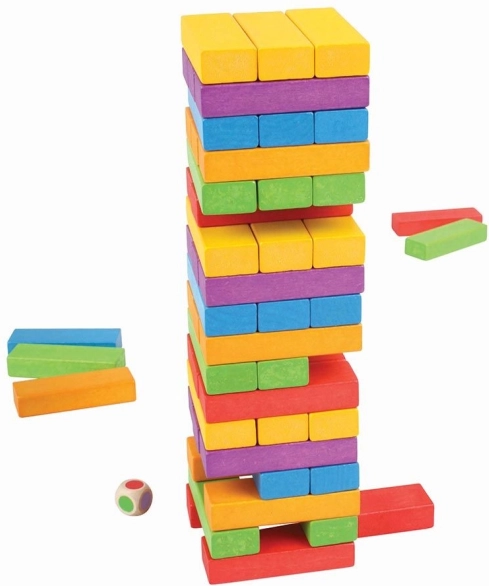 Ein spannendes und unterhaltsames Spiel für Klein und Groß: Ziehe entsprechend dem Würfelwurf farbige Holzsteine aus dem Turm – ohne dass er einstürzt. Dieser bunte Holzturm fördert Geduld, Feinmotorik und Hand-Auge-Koordination und sorgt für stundenlangen Familienspaß.