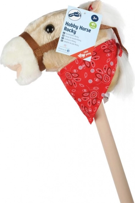 Steckenpferd Rocky ist mit einem Ohrknopf ausgestattet, der bei Druck ein realistisches Wiehern erzeugt, was der Spielautentizität zugutekommt.