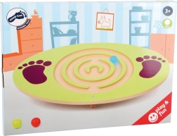 Das Produkt hat kompakte Abmessungen (45 x 30 x 6 cm) und hält einer maximalen Belastung von 50 kg stand, was es auch für die jüngsten Benutzer zugänglich macht. Das Set enthält ein Brett mit Labyrinth und drei farbige Kugeln.