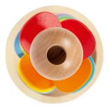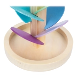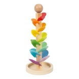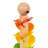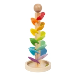 Jedes farbige Blatt hat eine andere Größe und erzeugt beim Kontakt mit der Kugel nach und nach höhere bis tiefere Töne. So trainieren Kinder Gehör, Konzentration und Geduld.