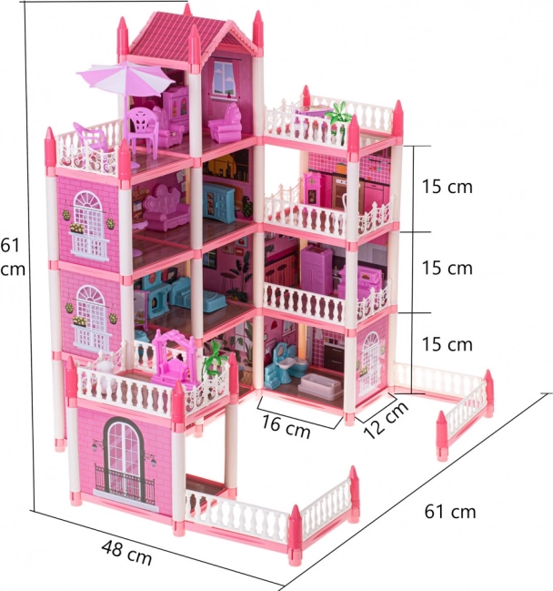 Toller Spaß für Ihre Kinder! Die Rosa Villa bietet endlose Möglichkeiten für kreatives Spielen. Kinder können die vier Etagen nach ihren Vorstellungen gestalten und ihr eigenes gemütliches Zuhause für Puppen schaffen. Das Set enthält Möbel und Dekorationselemente, die das Aussehen realistisch gestalten.