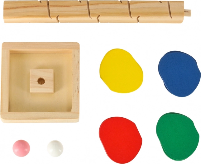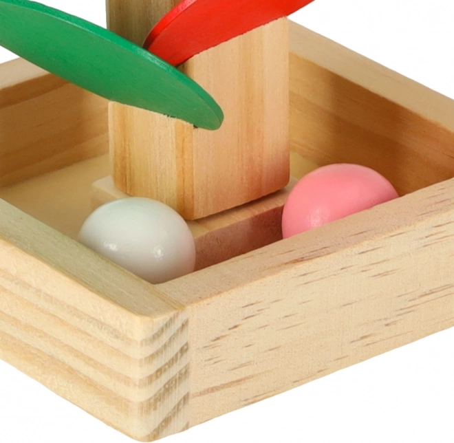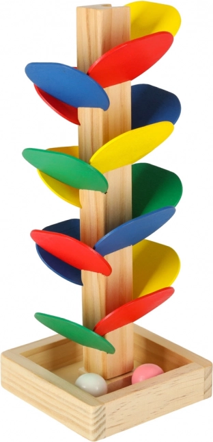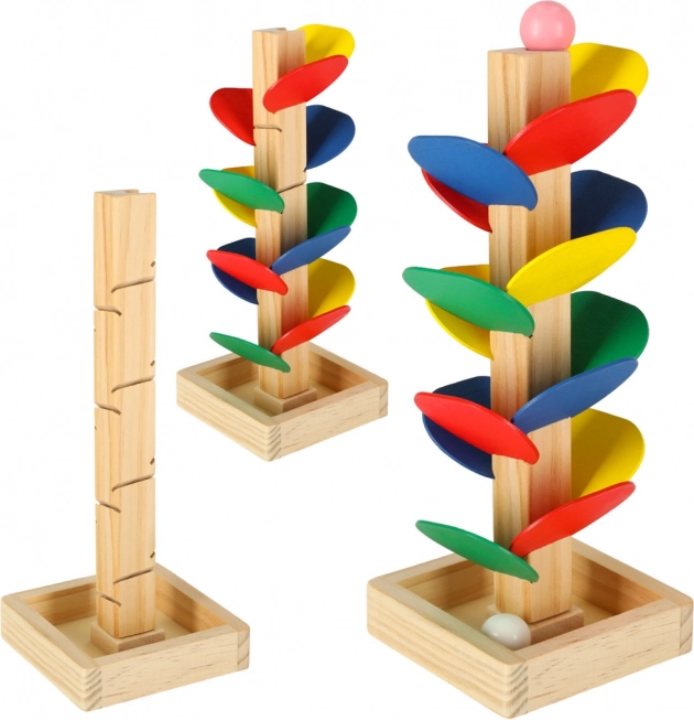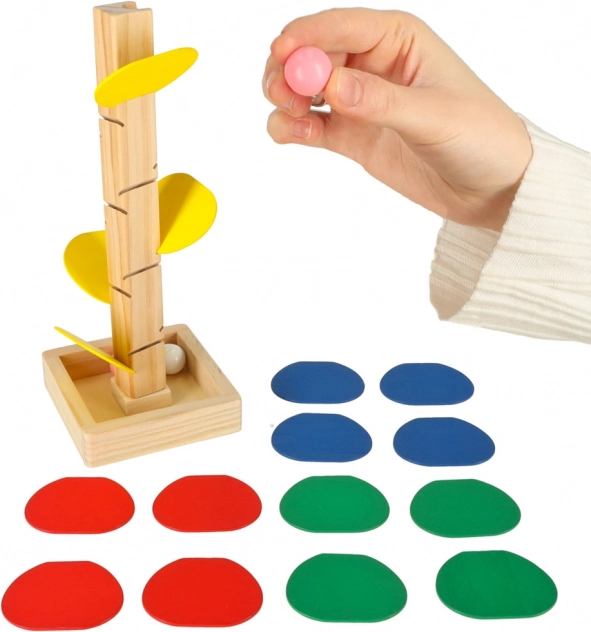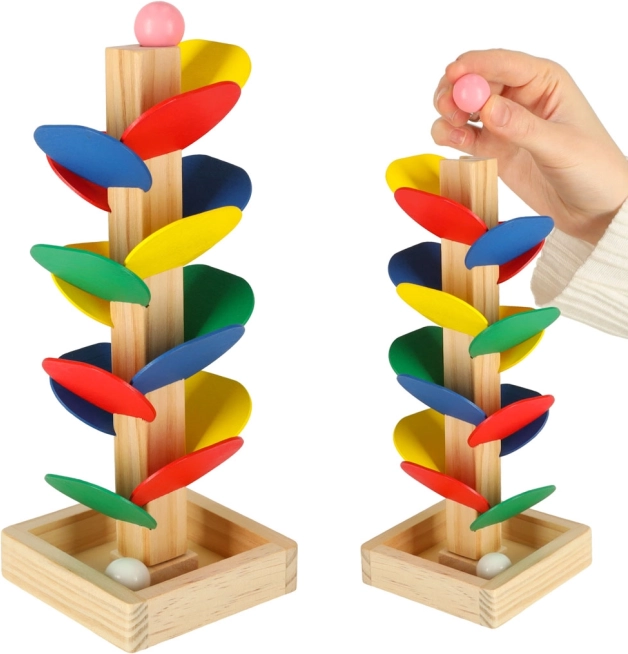 Kinder lassen die Kugel von der Spitze los, und sie dreht sich über die einzelnen bunten „Blätter“ und gleitet bis zur Basis. Jeder Aufprall erzeugt einen angenehmen Klang und motiviert zu weiteren Versuchen. Das Spiel fördert auf natürliche Weise die Feinmotorik, die Hand–Auge-Koordination, Geduld sowie das Farbempfinden und das Verständnis von Ursache–Wirkung.