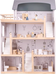 Das Haus hat bis zu vier Etagen und bietet jede Menge Platz zum Spielen! Die Holzterrasse im obersten Stock verleiht dem gesamten Haus einen besonderen Charme. Unter den vielen verschiedenen Räumen befinden sich ein Badezimmer, ein Arbeitszimmer, ein Wohnzimmer, ein Esszimmer mit Küchenzeile und ein Schlafzimmer. Jeder dieser Räume ist voll ausgestattet und bereit, eine neue Puppenfamilie zu begrüßen. Dank der großen Abmessungen passen nicht nur die kleinsten Puppen hinein – so müssen Sie keine Sorge haben, dass der Lieblingsfreund Ihres Kindes nicht mitspielen kann!