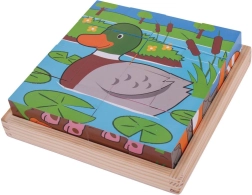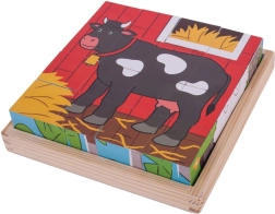 Bildwürfel mit Bauernhofmotiven begeistern kleine Baumeister und Tierfreunde. Aus sechzehn robusten Holzklötzen legen Kinder nach und nach sechs verschiedene Szenen – dazu müssen nur die einzelnen Würfel richtig gedreht und die passenden Teile gefunden werden. Das Spiel unterstützt auf spielerische Weise Hand-Auge-Koordination, logisches Denken und Geduld.