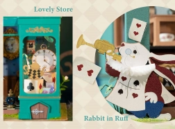 Entdecken Sie eine fantasievolle Miniaturwelt – der grün abgestimmte Teeladen mit Motiven des weißen Hasen, der Taschenuhr und des Schachbrettbodens erzeugt die Atmosphäre eines europäischen Nachmittagstees. Mit eingeschalteter LED-Beleuchtung verwandelt sich das Modell in eine bezaubernde Dekoration mit gemütlicher Abendstimmung.