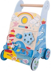 Das Lauflernhilfe beinhaltet verschiedene Aktivitäten wie Schiebepuzzles und drehbare Blöcke, die die motorischen Fähigkeiten und Koordination fördern.