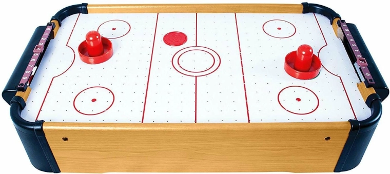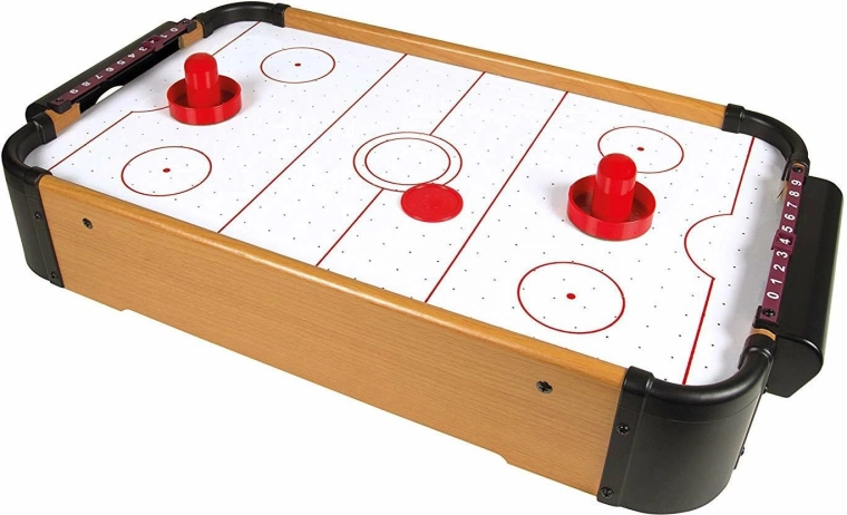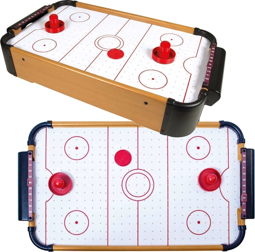 Der Tisch verfügt über einen stabilen Holzrahmen, integrierte Tore, einen manuellen Schiebepunktzähler auf beiden Seiten und wird mit zwei Schlägern und einem Puck geliefert. Das Spiel fördert Konzentration, Hand-Auge-Koordination und Fairplay.