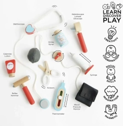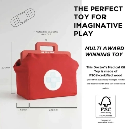 Diese designstarke Arzttasche aus der Honeybake-Kollektion von LE TOY VAN ist eine hervorragende Grundlage für Rollenspiele. Die Vintage-Stofftasche mit festem Boden und Holzgriffen verbirgt 10 sorgfältig gearbeitete Zubehörteile, mit denen Kinder echte ärztliche Untersuchungen nachahmen können. Ebenfalls enthalten sind druckbare Kärtchen mit „Arztrezept“ für ein noch realistischeres Spielerlebnis.