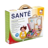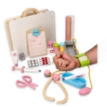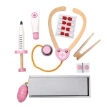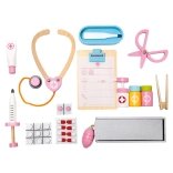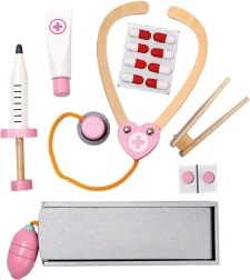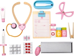 Das Set umfasst hölzerne Werkzeuge wie Stethoskop, Spritze und weitere Hilfsmittel, die realistisches Spielen unterstützen.