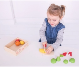 Das realistische Schneidebrett und das Holzmesser unterstützen gefahrloses Spielen in der Küche. Die Obstteile halten zusammen und lassen sich beim Schneiden leicht trennen.