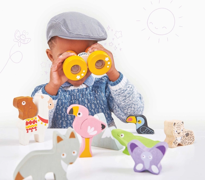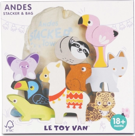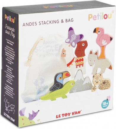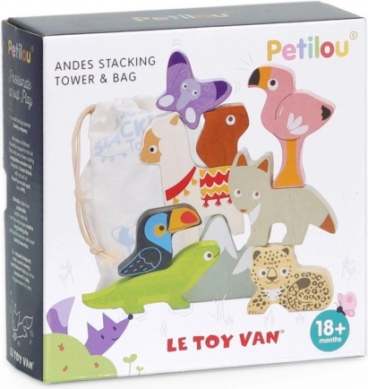 Dieser Anden-Stapelturm bringt das Abenteuer der Berge direkt ins Kinderzimmer. Das Set enthält robuste Holzfiguren von Tieren (z. B. Lama, Flamingo, Tukan, Eidechse, Schmetterling, Faultier) und ein Bergteil, die sich stapeln, ausbalancieren und zu lustigen Arrangements kombinieren lassen.