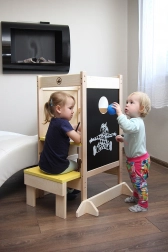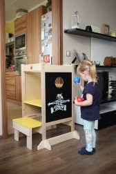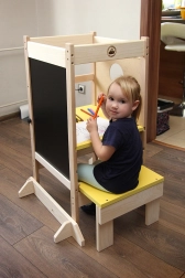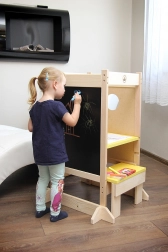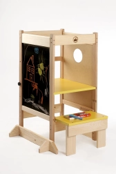 Dank des durchdachten Designs lässt sich der Turm auch in einen Tisch mit Stühlchen sowie in eine Kreidetafel verwandeln. Zwei Höheneinstellungen der Standfläche passen sich dem Wachstum des Kindes an und ermöglichen eine bequeme und sichere Nutzung.