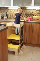 Die stabile Holzkonstruktion und die Umrandung um die Plattform ermöglichen Kindern, sicher die Arbeitsfläche zu erreichen und sich an alltäglichen Tätigkeiten zu beteiligen.