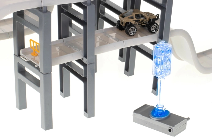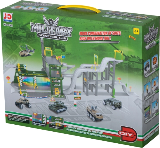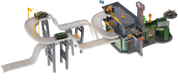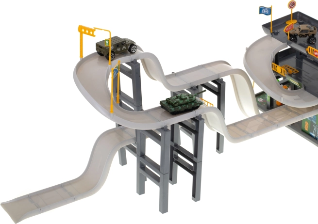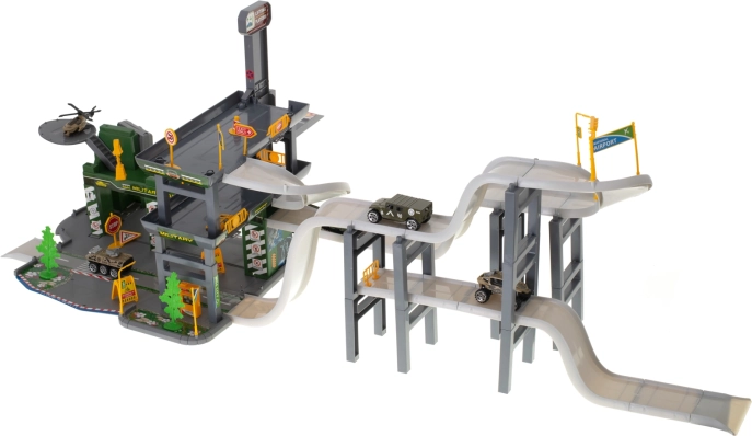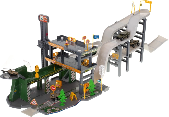 Im Zentrum befindet sich ein drei-stöckiges Gebäude - ein Parkhaus, das durch Wege mit weiteren Ebenen verbunden ist. Von hier aus können Sie direkt auf die Hochstrecke fahren. Stellen Sie Ihr Auto darauf und sehen Sie, wie schnell es nach unten rast! Im oberen Stockwerk gibt es auch einen Hubschrauberlandeplatz. Im Erdgeschoss befindet sich eine Tankstelle mit Benzinpumpen, wo die Fahrzeuge vor dem nächsten spannenden Abenteuer Kraftstoff nachfüllen können! In dem Set finden Sie 4 Fahrzeuge, die mit viel Liebe zum Detail gefertigt sind: ein Geländewagen, ein Geländelastwagen, ein Geländetransporter, ein gepanzerter Panzer und ein Hubschrauber! Jedes Fahrzeug hat bewegliche Räder und eine perfekt nachgebildete militärische Lackierung. Der Hubschrauber hat abnehmbare, bewegliche Rotoren. Alle Fahrzeuge sind in Tarnfarben, wie es sich für Militärfahrzeuge gehört. Mit einem solchen Set ist jede militärische Operation zum Erfolg verurteilt! In dem ästhetischen Bereich finden Sie viele Elemente der Geländeinfrastruktur wie Pflanzen, Schilder, Ampeln, Markierungen oder Barrieren. Teil des Sets ist auch ein großes Sticker-Set, das das gesamte Bauwerk belebt. Dieses Set ist eine großartige Gelegenheit, gemeinsam mit Gleichaltrigen und Erwachsenen Zeit zu verbringen. Dieses Spielzeug ermöglicht es, zu gestalten, zu entdecken, die Vorstellungskraft zu entwickeln und hat einen positiven Einfluss auf die Feinmotorik Ihres Kleinkindes.