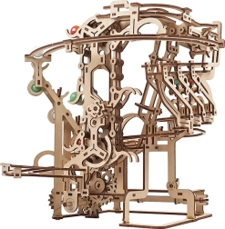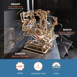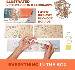 Diese ausgeklügelte Kugelbahn aus hochwertigem Sperrholz vereint Modellbauvergnügen, edukativen Mehrwert und entspannende Unterhaltung. Der manuell betriebene Kettenaufzug transportiert die Kugeln sanft zum Start, von wo aus sie drei separate Abschnitte mit jeweils einem einzigartigen Haupthindernis durchlaufen. Das offene Design betont die funktionale Mechanik und feine Details.