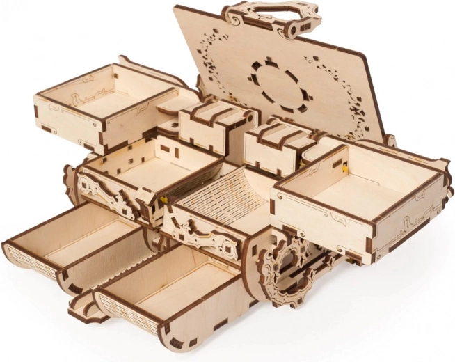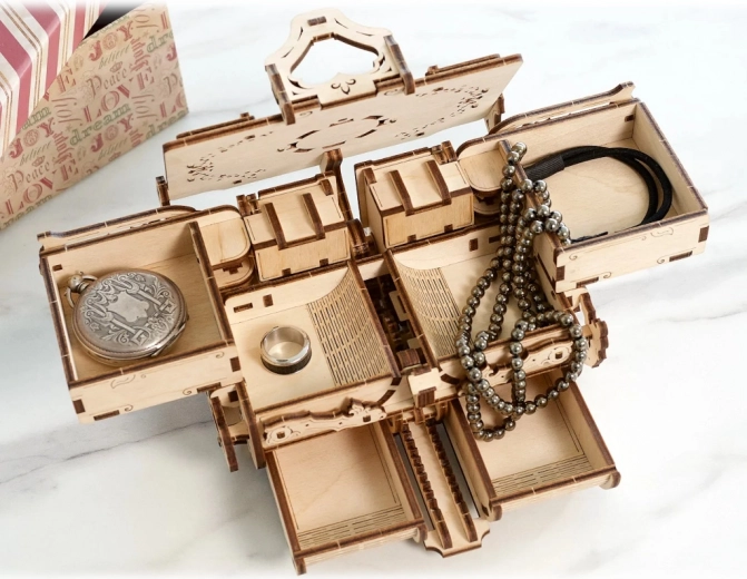 Die Schmuckschatulle besteht aus präzise ausgeschnittenen Holzteilen, die ohne Klebstoff ineinandergreifen. Nach dem Zusammenbau öffnet sie sich dank cleverer Zahnräder mit einer fließenden Bewegung.