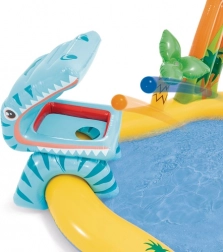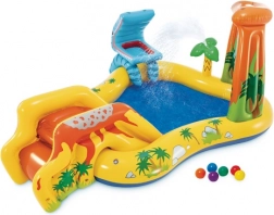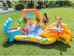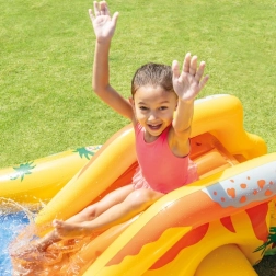 Verwandeln Sie heiße Tage in puren Spaß. Der aufblasbare Wasser-Spielplatz von INTEX bietet fünf Attraktionen in einem: ein flaches Planschbecken zum Toben, eine weiche Rutsche mit gepolsterter Landung, eine erfrischende Fontäne und einen Wasservorhang, die an den Schlauch angeschlossen werden, sowie lustigen Wasser-Basketball mit bunten Bällen. Dank der universellen Maße eignet er sich für Garten, Terrasse und sogar für Ausflüge an den Strand.