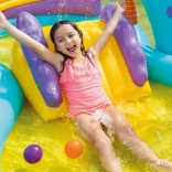 Machen Sie Kindern an heißen Tagen eine Freude mit dem farbenfrohen Wasserspielplatz INTEX Dinoland. Er kombiniert eine aufblasbare Rutsche, eine weiche Landematte, eine unterhaltsame Wasserfontäne und Spielzubehör – 2 Ringe, 6 Bälle sowie einen Wurfkorb. Das geräumige Planschbecken mit Dinosauriermotiv sorgt für stundenlangen, sicheren Wasserspaß.