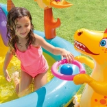 Der fröhliche Wasserspielplatz Intex Dinoland verwandelt den Garten in einen Ort voller Sommerspaß. Kinder rutschen über die aufblasbare Rutsche ins Planschbecken, kühlen sich unter der Wasserfontäne ab und spielen mit dem aufblasbaren Dinosaurier mit Wurfkorb. Die weiche Landematte erhöht Komfort und Sicherheit beim Toben.
