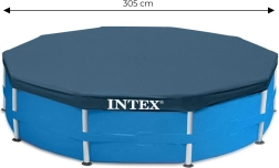 Praktische INTEX-Abdeckplane für Rahmenpools mit 305 cm Durchmesser schützt das Wasser zuverlässig vor Verunreinigungen und hilft, die Temperatur zu halten. Hergestellt aus robustem Vinyl (110 g/m²), bietet sie passgenauen Sitz, einfache Montage mit Zugkordel und bleibt dank 25 cm Überhang sicher an Ort und Stelle.