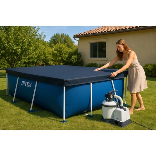 Die INTEX-Abdeckung ist für rechteckige Rahmenpools 300 × 200 cm konzipiert. Dank des robusten Materials widersteht sie Witterungseinflüssen und hilft, das Wasser vor Laub, Insekten und Schmutz zu schützen. Ein Überstand von ca. 20 cm und die Fixierschnur sorgen für stabilen Halt, damit die Abdeckung nicht verrutscht.