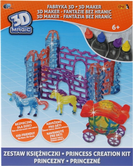 Mit 3D MagiDeluxe erstellen Sie ganz einfach originelle 3D-Modelle – von Schlössern über Kutschen bis hin zu zauberhaften Figuren. Verwenden Sie einfach das 3D Magic Gel, wählen Sie eine Form oder Schablone und lassen Sie das Werk unter UV-Licht aushärten. Das Ergebnis ist stabil, farbenfroh und bereit zum Spielen oder Ausstellen.