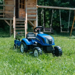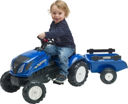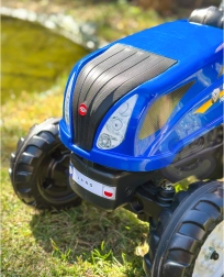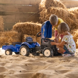 Der Trettraktor, inspiriert von echten Maschinen von NEW HOLLAND, vermittelt Kindern ein realistisches Fahrerlebnis. Dank der öffnenden Motorhaube mit Motorimitation können kleine Fahrer das „Innenleben“ des Fahrzeugs erkunden, während der Kettenantrieb auf der Hinterachse für eine geschmeidige Fahrt sorgt. Der abnehmbare Anhänger eignet sich ideal zum Transport von Spielzeug oder kleinen Lasten im Garten.