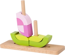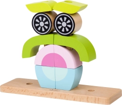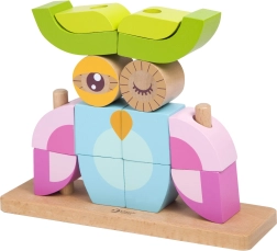 Farbige Holzelemente auf einer Basis mit Stiften ermöglichen das Gestalten einer Eule sowie weiterer Formen und Tiere. Das Spielzeug wächst mit dem Kind – von einfachen Zusammenstellungen bis hin zu komplexeren.